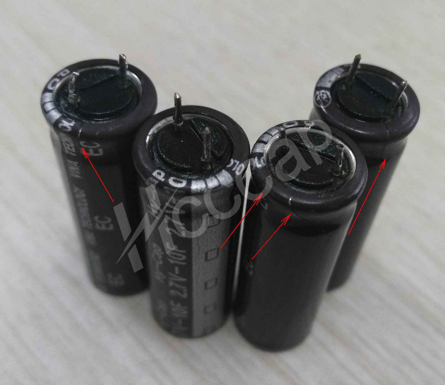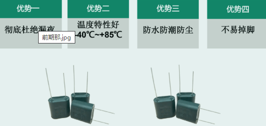 2. 脚间距偏小的超级电容(含其他类型正负极间距偏小的电容),由于固体表面的吸附特性,两极在较严重的凝露环境下易构成通路,特别是在凝露挥发困难或缓慢的地方。【脚距小】【带电】
